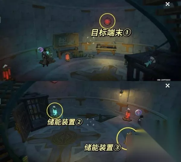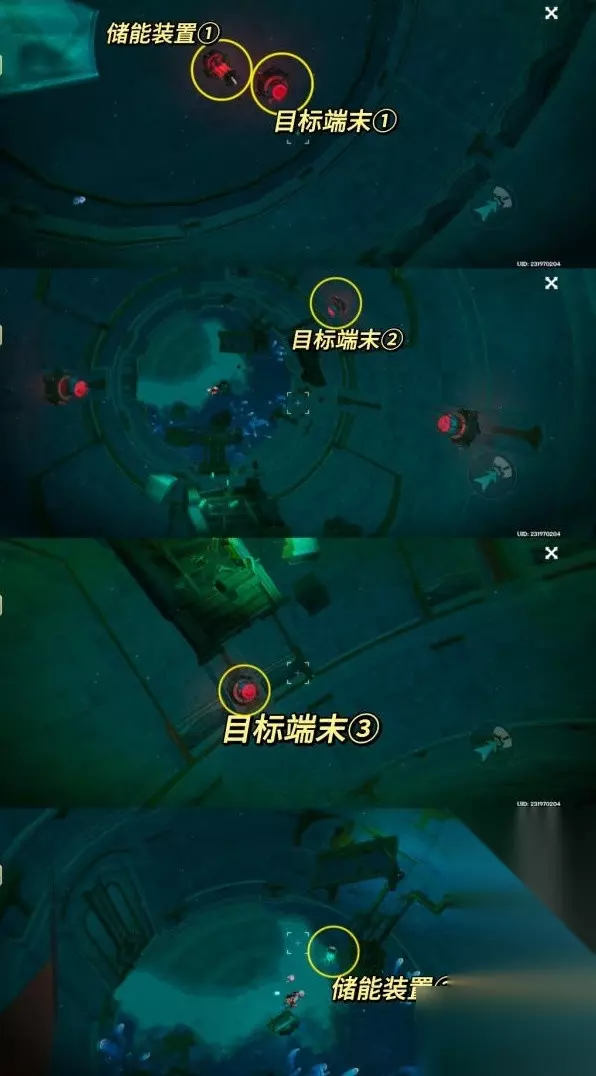 在视野中,我们先移动准星瞄准目标端末①号,静止几秒,等待视野自动切换。 视野切换后接着瞄准目标端末②号,再次切换视野。 瞄准目标端末③号,再切换一次视野。 这次切换过来后,把视角往下移,对准储能装置②号,点击吸收能量。