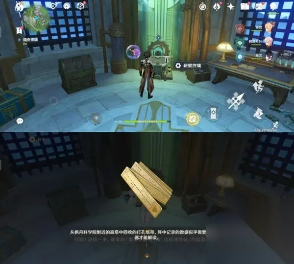 5.上来顶层后,我们直接操作面前的研察终端。 任务「往事追迹·北」完成。 这里同样有一个珍贵宝箱和摩拉盒,大家可以一起拿了。