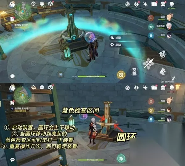 6.继续探索高塔。 直接往楼上走,但这个时候通往顶层的路还是关着的,我们需要完成一下面前的解谜。 这个叫稳定器的装置启动后圆环会开始上下移动,我们需要做的是在圆环移动到亮起的蓝色检查区间时,击打一下装置。成功操作几次后即可完成解谜。 这个时候通往顶层的路也打开了。