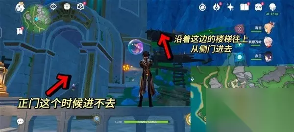 1.传送到新枫丹科学院的锚点,往西北方向图示位置的高塔前进。 这个高塔目前我们无法通过正门进去,需要沿着旁边的楼梯往上,由侧门进。 进入高塔后任务自动触发。