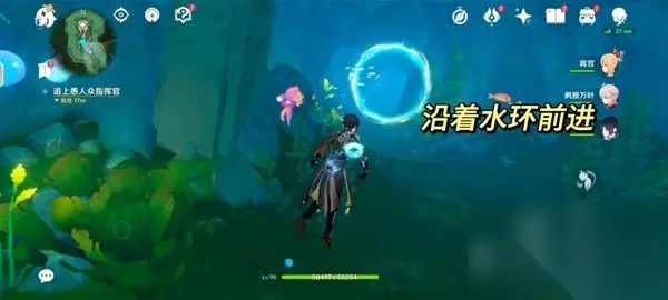 进入水里后,沿着面前的水环前进,它会送我们到目的地。