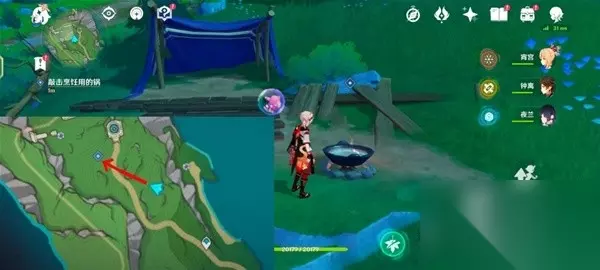 调查完,往西北方向走,来到这里的愚人众营地。敲击一下面前用于烹饪的锅。