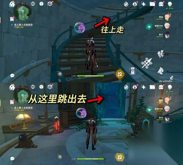 6.追上愚人众指挥官 由于水下的门又被锁住了,我们需要沿着旁边的楼梯往上走,来到上一层。从刚刚出去的地方再次跳出去,潜入水中。