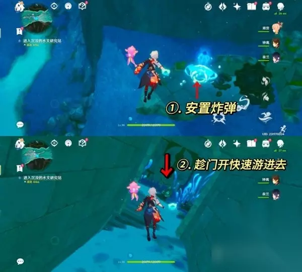 接下来我们可以通过攻击晶体机关来打开研究站的大门,但这个门很快又会关起来。 所以我们先长按技能键在晶体机关旁边安置帽子炸弹,然后游到大门边,再次点击技能引爆炸弹,大门一打开就快速游进去。