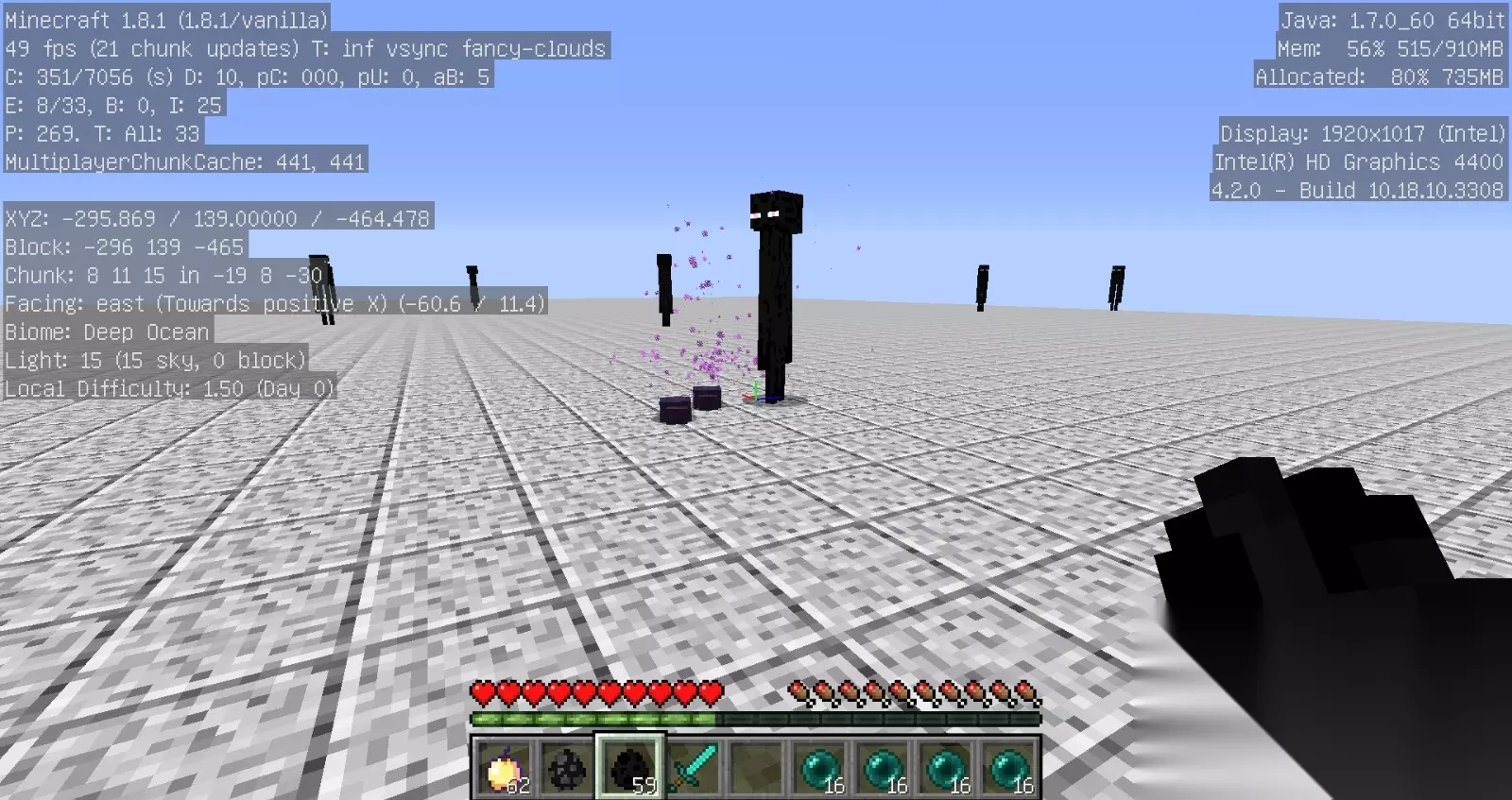 获取末影螨主要依赖末影珍珠的投掷行为,每次扔出末影珍珠时,脚下约有5%概率生成一只末影螨,平均每20颗珍珠能出一只,属于低概率事件。末影螨不会自然生成于任何地形或维度,仅能通过此方式或末影人瞬移触发,末影人瞬移初始有15%生成概率,但每生成一只概率降低1%。首先需要大量末影珍珠,可通过与牧师村民交易、末地城宝箱或击杀末影人获取珍珠。建议在生存模式下搭建封闭平台,用玻璃或圆石围出3×3空间,高度至少两格防止末影人瞬移进入。
