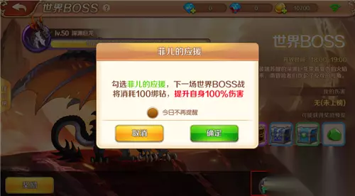 【应援系统】 应援系统是为了帮助玩家提高伤害,争夺最后一击与排名而准备的系统。玩家只需消耗少量的绑定钻石,就可以获得大家熟悉的角色的应援。 我们的小精灵菲儿是不是很可爱呢?这次我们选择菲儿的应援,足足提升100%的伤害。有了她的热情鼓励,相信各位冒险者一定能在世界BOSS的战斗中奋勇杀敌,抵御深渊巨龙的入侵。