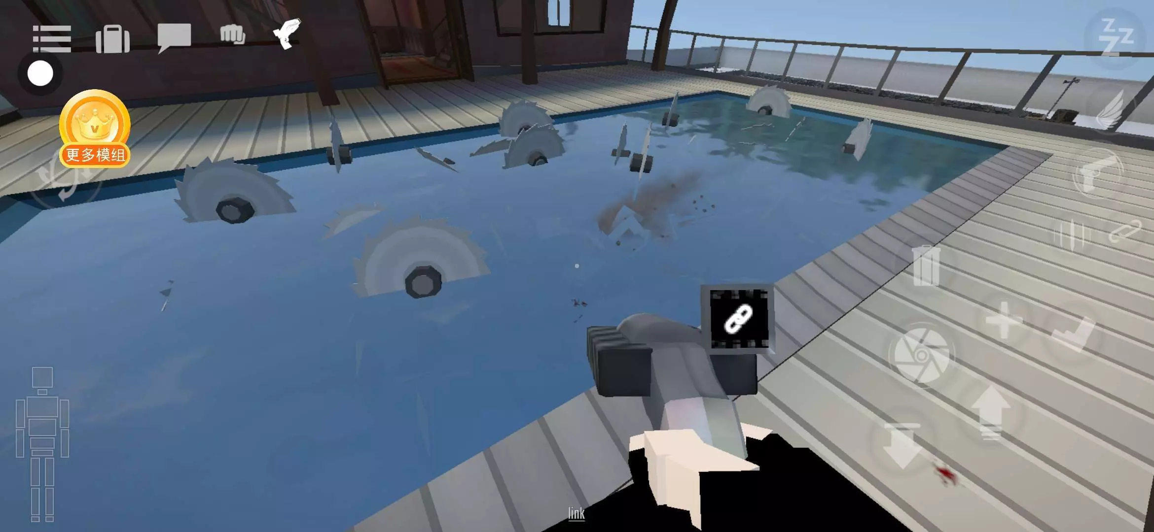 每个人在游泳馆里游泳都不怎么激动,如果不激动的话,会导致感冒非常的危险。于是我就发明了这个电锯游泳池,设计非常银杏啊,我刚刚拿了一个疯子,试了一下,刚刚那疯子直接从泳池上跳了进去,然后就不出来了,你看他都已经多舒服呀,非常的好用
