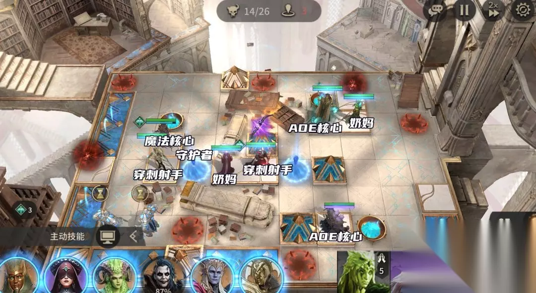 BOSS在读条结束后会开始前进(在BOSS读条结束前,西拉斯可以开大输出两波,这个阶段BOSS会剩下30%以下生命值),这时候我们守护者的防守压力就会特别大,所以要在红框位置补个前排。AOE法核开大先清理毁灭者,随后再解BOSS。 三、N9-26
