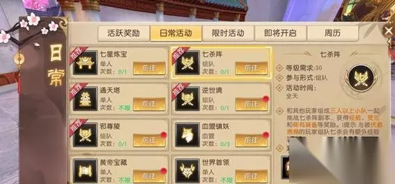 【副本信息】 等级要求:30级以上的玩家3-5人可以组队进入通关奖励:经验、灵元、银票、装备,七杀阵通关宝箱(打开可以获得银票和灵酒)活动时间:全天特别说明:3星通关过该副本的轩辕勇士也可以通过使用金票进行扫荡,如果当天没有完成该副本也可以在第二天选择使用金币或者银票在资源追回页面进行完美或者普通追回 【副本玩法】作为新手玩家第一次进入七杀阵的话都会有一个打法提示,击杀昆仑奴·铜可以获得一点连击,击杀昆仑奴·银可以获得2点连击,击杀昆仑奴·金可以获得3点连击,击杀昆仑寒玉可以获得7点连击。完成所有阵就会解封boss饕餮,击杀饕餮就可以顺利通关了。 【副本重点】七杀阵实际上是5阵,除了第一阵是5个昆仑奴之外,后面4阵都是20个昆仑奴,每集满7点击杀,获得经验翻倍,7连击的次数越多,获得的经验翻倍也就越高。所以在击杀昆仑奴的同时要注意观察副本上方的击杀提示条。 如转载涉及版权等问题,请作者与我司联系,我司将在第一时间删除或支付稿酬。