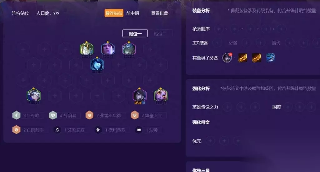 基础成型是七人口,搭配的羁绊有3巨神峰、2盲眼射手、4神谕者、2弗雷尔卓德,如果上八人口,只可以再上一个瑟庄妮,搭配3弗雷尔卓德。 英雄传说之力可以带崔斯特或者是塔姆的 带崔斯特的话,前期可以先合一套装备,锁血会更稳,而且,后期无论是主C、主坦还是副C,都可以搞一套合适的装备。因此,如果你的厄辈琉斯只能到两星的话,肯定是带崔斯特的战力更高。当然,带塔姆的话,经济会比较高,追三星会更稳。