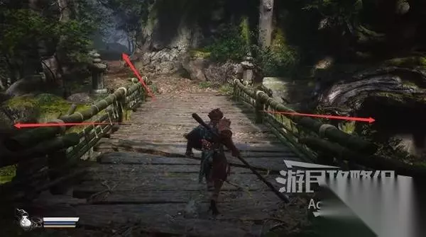 (本游戏的地图比较绕,建议小心点跟着我走,避免迷路。其实很多路都是相通的,我尽量安排好顺序,带你省心地探索完每条路。另外,遇到的妖怪建议都打死,避免遗漏妖怪图鉴、掉落物。) 往前走有座桥,过桥后会来到一片比较大的区域。 向左跳到桥下面顺着河流走,和直接过桥向前走,这两条路是相通的,等下再去。 先向右跳到桥下面到河流的源头,有灵蕴(货币)可以采集。