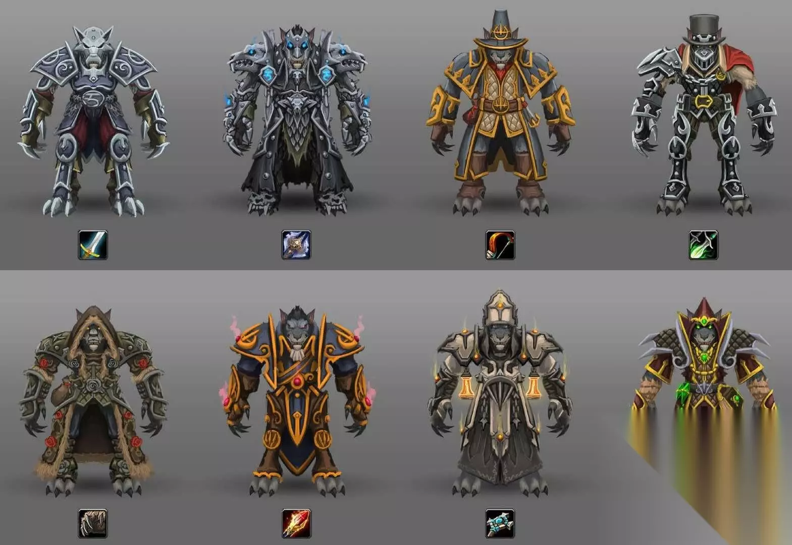 狼人种族的套装完善程度与黑铁矮人保持一致,8大职业的套装中最有意思的莫过于DK、猎人和战士套装了,虽然目前还没有贴出模型素材但是从视觉感官来看还是非常值得期待的。由于狼人种族自带两种模型所以未来套装效果一定会很好的适应人型和狼人形态。不知道大家更喜欢哪一套呢? 同盟种族或曝光