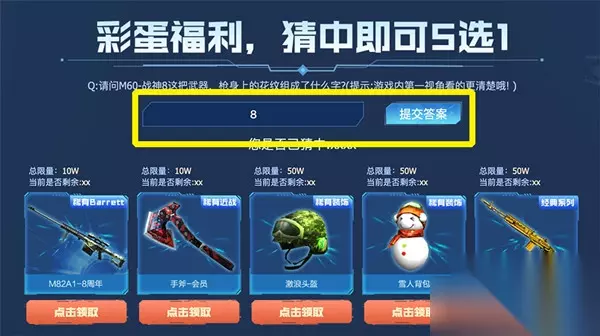 另外在这个活动中还有一个彩蛋答题环节: Q:请问M60-战神8这把武器,枪身上的花纹组成了什么字?(提示:游戏内第一视角看的更清楚哦! ) 正确答案:8