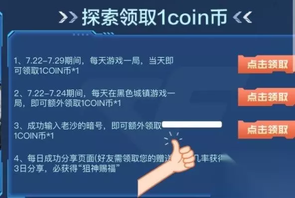 穿越火线老沙的暗号分享 老沙的暗号1:齐聚CF8.6火线盛典 老沙的暗号2:齐聚CF8月6日火线盛典 老沙的暗号是穿越火线最新8.6火线盛典预热活动的一环,玩家们参与活动,完成任务领取1COIN币,1COIN币可兑换超多道具! 任务包括如下: 1、7.22-7.29期间,每天游戏一局,当天即可领取1COIN币*1 2、7.22-7.24期间,每天在黑色城镇游戏一局,即可额外领取1COIN币*1 3、成功输入老沙的暗号,即可额外领取1COIN币*1 4、每日成功分享页面(好友需领取您的赠送),有几率获得“狙神赐福”,累积3日分享,必获得“狙神赐福”
