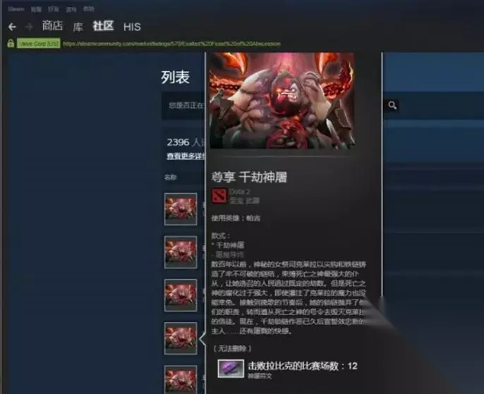 DOTA2屠夫至宝解锁攻略 1、打开steam客户端,选择社区,然后在社区的子菜单选择市场,在市场中选择DOTA2。 2、在DOTA2市场中找到千劫神屠装备,点击进入购买页面。 3、寻找已经解锁完成的千劫神屠 装备,千劫神屠第二款的要求是在一句中对方有拉比克的情况下赢得比赛,共需要赢得12局。
