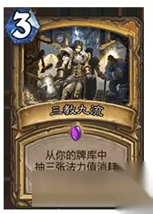 过牌体系除了两个神恩术以外我还带了一张三教九流,有效的解决了摸不到神恩术就GG的问题。卡组中1费生物多达10个,完全不用担心摸不满三张。3费过3张,在这套卡组中这张卡比奥术智慧和先祖知识不知道高到哪去了。 至于带两张则完全没有必要,先是容易卡手,而且等你用出第二张的时候牌库中可不一定有足够数量的1费生物让你抽啦。