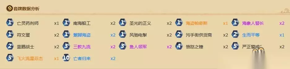 首先是海盗体系,由于海盗实在太强了,打不过那就加入吧!蹩脚海盗这张单卡有多强已经有太多人说过了,但我还是要吐槽一下,这张卡比起以前的齿轮大师王师傅有过之而不及,也让帕奇斯有了一个稳定的登场机会。在这套卡组中,南海船工的相性也非常好,由于基本不会断武器,所以一旦出场通常都是21冲锋,有时还附带一个11小野菊,还能配合三教九流。 作为本卡组的核心体系,同时又是炉石传说——加勒比海盗传的主打种族,海盗如今已经足以撑起一套卡组了。