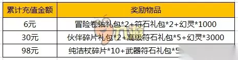 活动三:单日累充送遥之专属武器! 【活动内容】:活动期间每日累积充值达到指定金额,即可获得超值游戏好礼!每天一次参与机会,达成98元,就能获得纯洁杖碎片*10哦!连续3天参与该活动即可合成遥之专属武器-纯洁杖! 【活动区服】:所有服务器 【活动时间】:2015年5月14日-5月18日 【活动规则】: ①活动期间,累积充值满指定金额即可领取该档以下所有奖励,如累积充值满98元即可获得所有奖励。 ②满足条件后,获得的奖励请前往“运营活动" 中领取,领取后,礼物将自动进入礼物盒中,请在活动结束日24:00前及时领取,逾期未领取系统将自动发放礼物盒中,活动期间每档奖励限领一次。