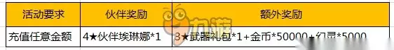 公测充值活动攻略: 活动一:公测首次任意金额充值送4★伙伴! 【活动内容】:首次充值任意金额,即可获得价值8888宝石的豪礼回馈哦! 【活动时间】:长期 【活动范围】:所有服务器 【活动规则】:首次充值任意金额即可获得。