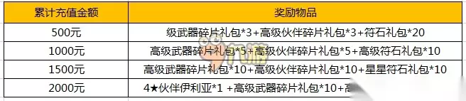活动二:累计充值得4★伙伴“绝版黑骑士" ! 【活动内容】:活动期间累积充值达到指定金额,即可获得超强绝版4★伙伴“伊利亚" !仅限前五天哦! 【活动区服】:所有服务器 【活动时间】:2015年5月6日-5月10日 【活动规则】: ①活动期间,累积充值满指定金额即可领取该档以下所有奖励,如累积充值满2000元即可获得所有奖励。 ②满足条件后,获得的奖励请前往“运营活动" 中领取,领取后,礼物将自动进入礼物盒中,请在活动结束日24:00前及时领取,逾期未领取系统将自动发放礼物盒中,活动期间每档奖励限领一次。