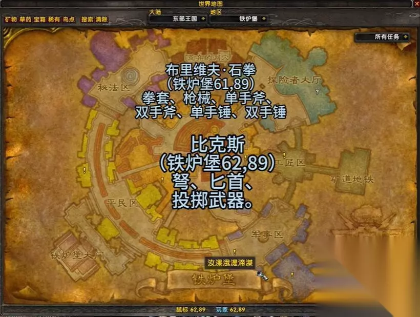 乌龟服武器大师在哪 一、铁炉堡 1、布里维夫·石拳 位置坐标为(61,89),可以学习拳套、枪械、单手斧、双手斧、单手锤、双手锤。 2、比克斯 位置坐标为(62,89),可以学习弩、匕首、投掷武器。