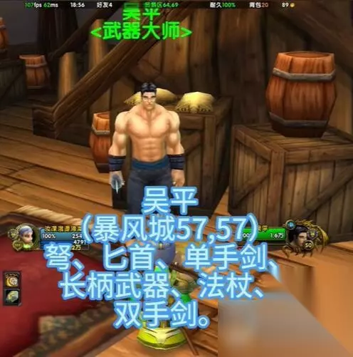 二、暴风城 1、吴平 位置坐标为(57,57),可以学习弩、匕首、单手剑、长柄武器、法杖、双手剑。