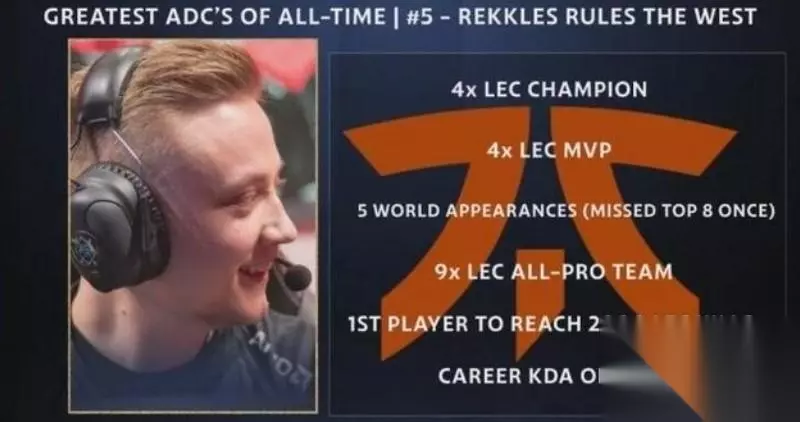 第四名是Rekkles,欧洲高学成,可能有些新读者并不知道高学成是谁,但weixiao总听说过吧,没错微笑就是高学成,那个给AD加上了C的男人。能收获这样一个称号,和早期的AD之神相提并论可见Rekkles的实力了,世界赛取得过一次亚军,4次LEC冠军、4次LEC常规赛MVP,确实是欧洲AD位置的统治者。