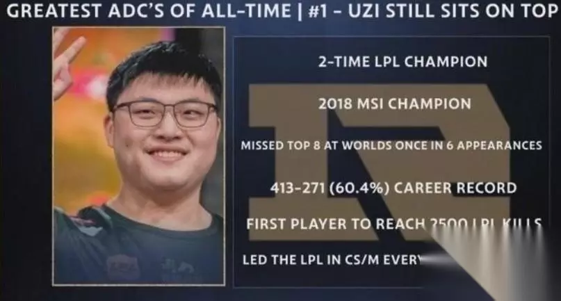 第二名:Uzi,确实是无可争议的AD第一人,也是所有AD仰望的目标,即便是隐退一年半之后,传来复出的消息依然让所有人为之一振。2次世界赛亚军,一届MSI冠军,2次LPL冠军,虽然没有世界赛冠军AD的荣誉等身,但依旧无法阻止Uzi成神的脚步。