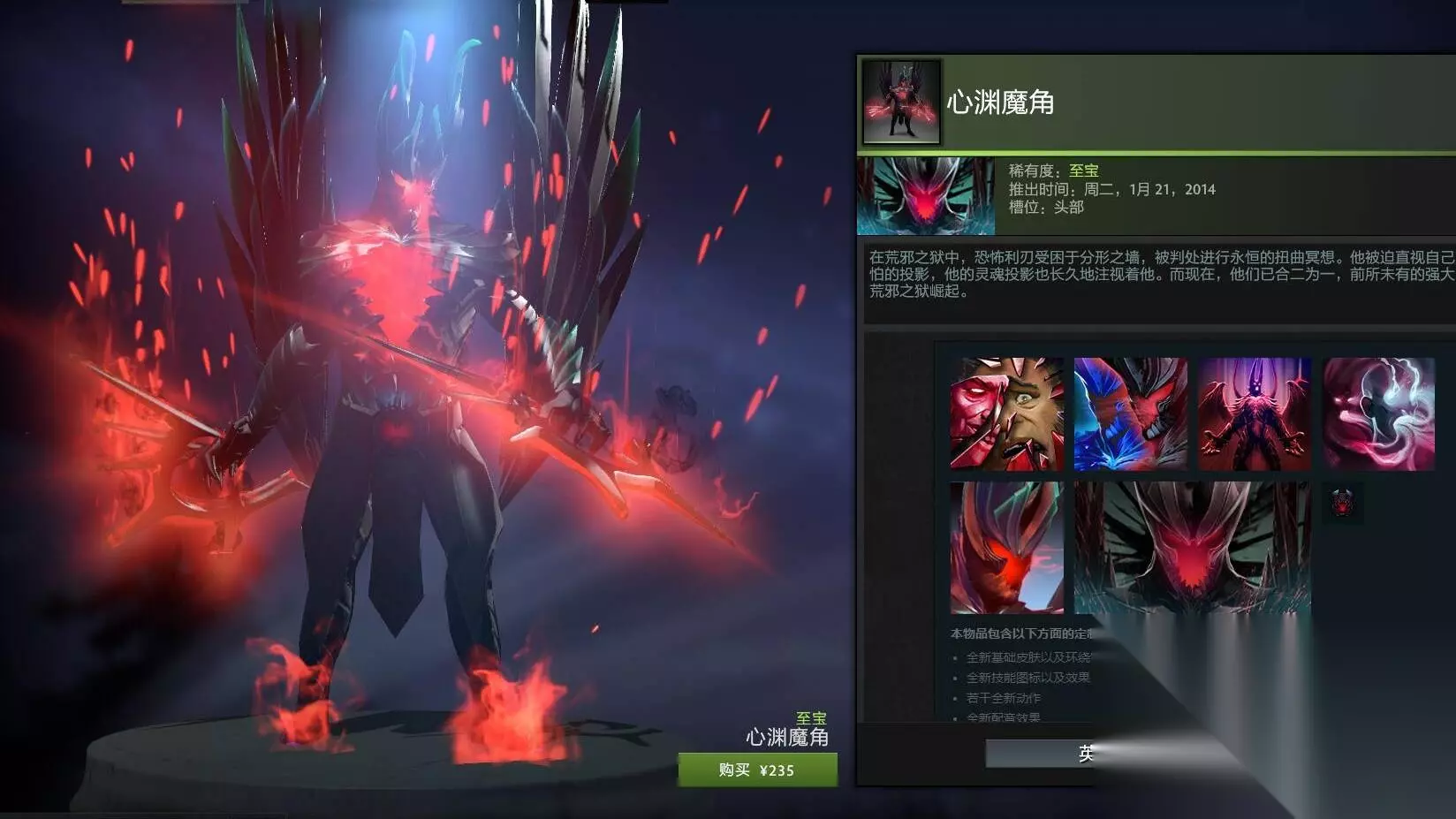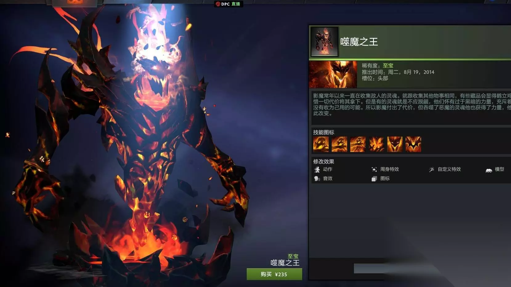 1.噬魔之王。这款模型一眼看去,就会让玩家回忆起DOTA1中炎魔的形象。它的独特之处在于收魂动画和影压的三段计数,使得魂之挽歌的观赏效果更具有冲击力和“爆炸性”。总体来说,影魔的特效非常炫酷且充满霸气,完美地突显了英雄的独特性质。