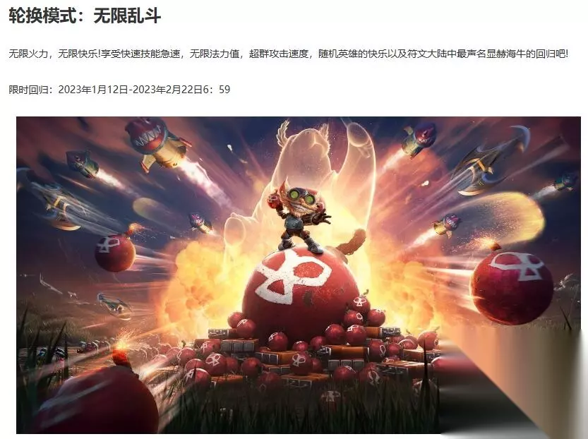 详细介绍 1、官方发布信息,在2024年2月1日-2024年3月12日,国服的无限火力就会开启了 2、在春节期间,无限火力将会限时回归,持续1个半月,40天的时间,并且同期斗魂竞技场不会关闭。 以上就是《英雄联盟》无限火力2024时间表一览的全部内容了,希望玩家可以顺利的知道怎么获取,更多精彩内容请关注233乐园游戏。