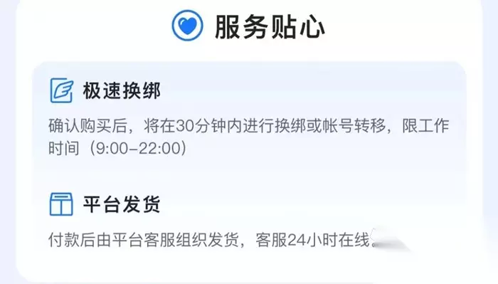 只要是在交易猫平台的工作时间内(9点-22点),消费者在确认购买后都可以享受令人惊叹的极速换绑服务,这种效率对比其他小平台动辄一两天的等待时间真的是硬了太多。试想你经过一两个小时的对比和思索,最终选择了一个非常适合自己的账号准备入手,若是确认购买后迟迟得不到答复,估计绝大多数的人都会担心自己上当受骗。因此交易猫的高效率绝对是业界良心。