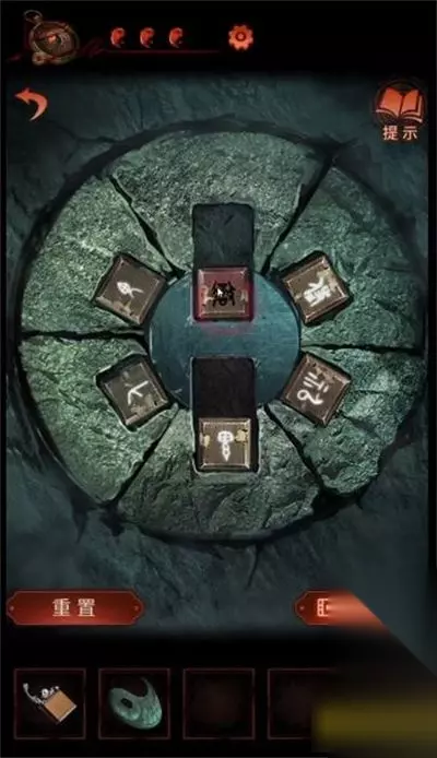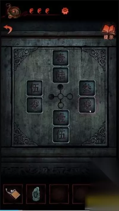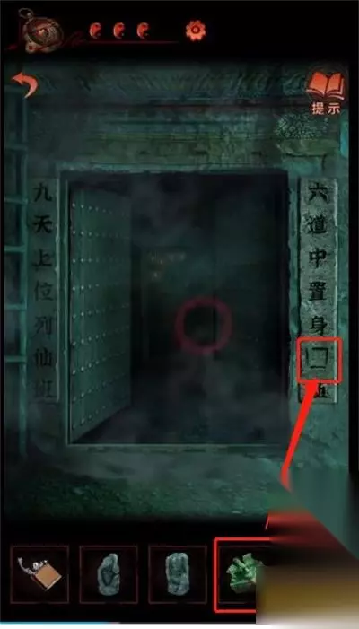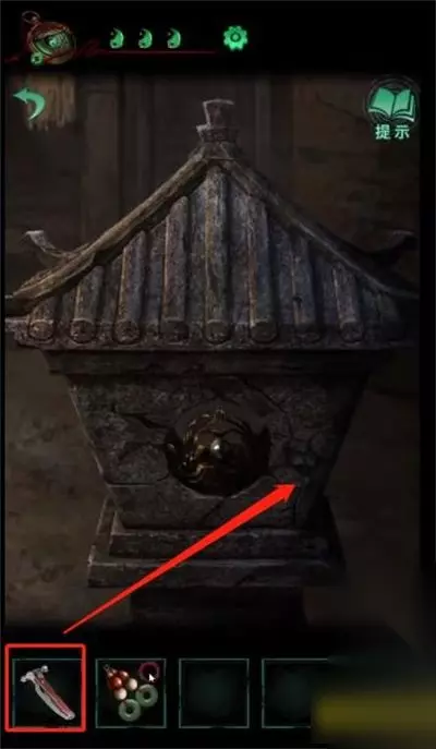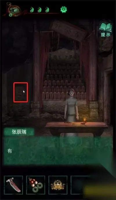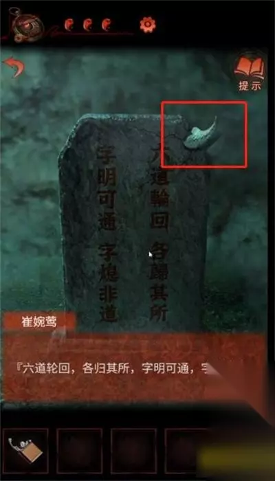 一、纸嫁衣4第五章完整图文攻略 1、首先,切换成女主崔婉莺(绿色界面),拿上石碑上的鱼形物件。