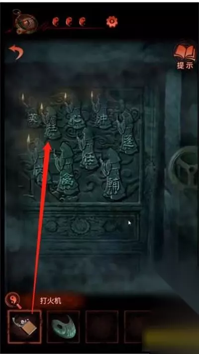 7、切换女主视角,进入大门,根据缝中的纸条线索,用打火机点燃浮雕上相应人物的火把,获得鱼形物件。