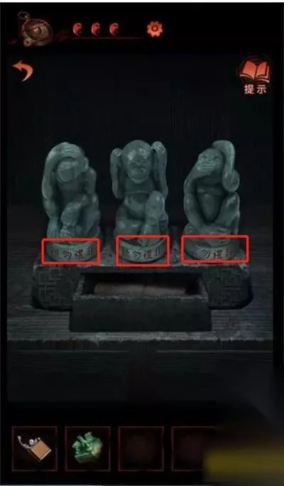 23、进入最左侧书屋,点击书柜,将三个猴子雕像放在相应描述的位置上,获得线索1。