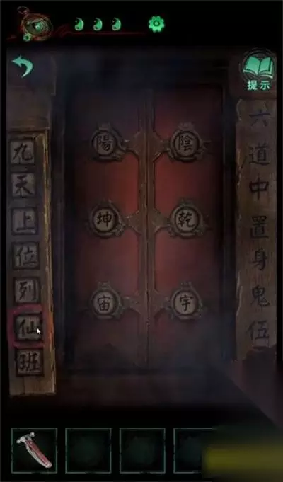 6、换到男主视角,按照上两处线索结合,门上左边是“乾宙坤”右边是“神凡鬼”。获得一对耳环;
