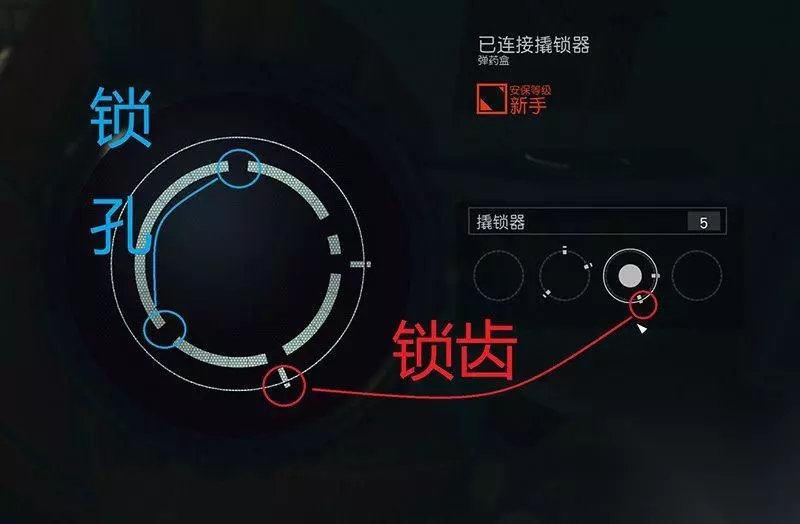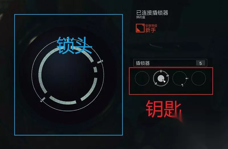 «1234567»友情提示:支持键盘左右键"←""→"翻页 ---上手指南--- (说明:上手指南随游戏进程逐步补充,笔者先将开锁、说服等大家关心的系统内容总结出来。) -开锁 ①综述 开锁时,左侧(蓝框内)会有数层大圆环(锁头),每个大圆环上都随机出现缺口,我们可以称其为锁孔。 右侧(红框内)会有数个小圆环,我们可以称之为钥匙,每把钥匙上也会有数量不同的插头,我们可以称其为锁齿。 简单来说就是把右侧的插头插到左侧的缺口中(锁齿插到锁孔中),将锁头圆环补齐(填补成完成的环)就能开锁。