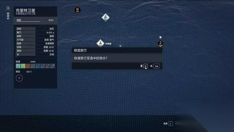 tab界面点击左上星图或者M地图点击左侧星图(或者tab递进到星图)。 选择克里特卫星,按X设定航线就能快速前往目的地了。