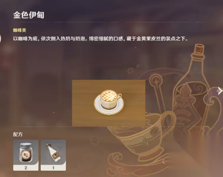 《原神》曲生酌微梦金色伊甸配方介绍 一、配方介绍 金色伊甸=2咖啡+1牛奶 用咖啡作为底料,根据顺序导入热牛奶和奶泡,创造绵密细腻的口感,藏于金黄果皮丝的装点之下; 其他咖啡: 图书馆:3咖啡 金色伊甸:1咖啡+1牛奶 月夜暗巷:1咖啡+牛奶+可可 焦糖松果:1咖啡+1牛奶+1焦糖 远礁浮沫:2咖啡+1气泡水