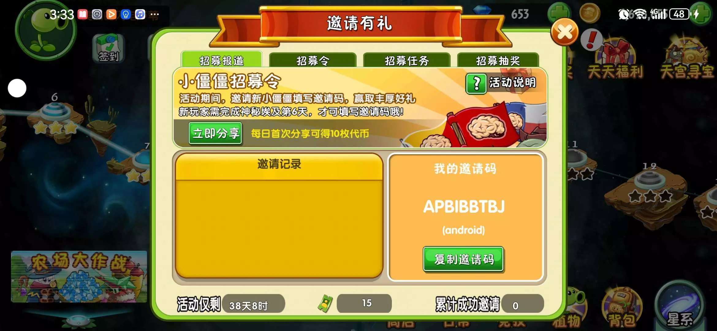 帮忙搞一下植物大战僵尸的玩家搞一下爸爸们们邀请有礼们我的遨邀请码