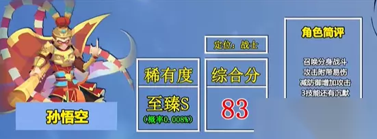 3、孙悟空:属于是战士类型的角色,拥有着召唤分身的能力,攻击附带有易伤效果,可以减少敌方的防御以及增加攻击的效果,技能还带有沉默效果。