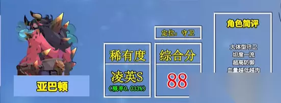 3、亚巴顿:属于一个大型的守卫角色,本身的坦度是非常的高的,血量越低时会变得越肉,还可以免死属于小强类型的角色。