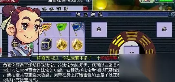 而再合成1级以上的法宝时则要注意五行的相生相克(相生:金->水->木->火->土->金,相克:金->木->土->水->火->金)。并且需要一个一级法宝和三眼天珠、九眼天珠、人参果等特殊物品。