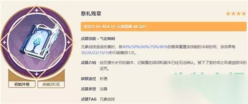 推荐武器二:祭礼残章 满级的情况下副词条元素精通最高可达221,武器特效也支持重置CD技能; 可以让草神连续两次释放E技能,加快大招的充能循环,本身技能CD就只有5/6秒,大招50点能量即可启动;