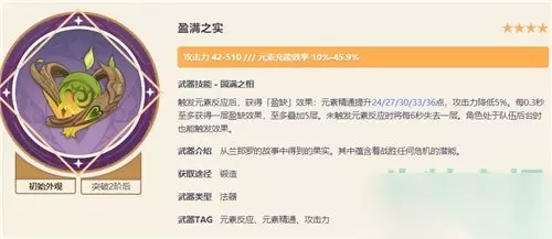 推荐武器三:盈满之实 平民玩家可以选择的一把四星的锻造武器,比较容易满精; 并且对武器的等级也比较有考量,副词条也有元素充能加成,就算圣遗物没有充能词条,也能保证大招循环。