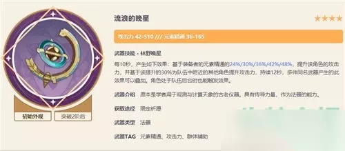 《原神》草神纳西妲四星武器选择推荐 推荐武器一:流浪的晚星 作为制定的四星辅助专属武器,副词条能够增加165的元素精通; 满级的情况下可以对队伍的全部觉得提升200点的攻击力,队伍增伤效果明显; 如果玩家比较偏向于妮露的绽放队伍,那么这把流浪的晚星选择级别就没有那么大了;