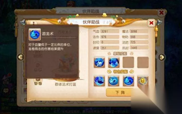 而另一位助战就是七日签到获得的东海龙王,他的初始特色技能是有概率触发法术连击,而天脉技能解锁后群秒可以对血量低于一定比例的单位造成更大的伤害。这里我们需要将天脉技能点出来,地脉技能目前并不重要。