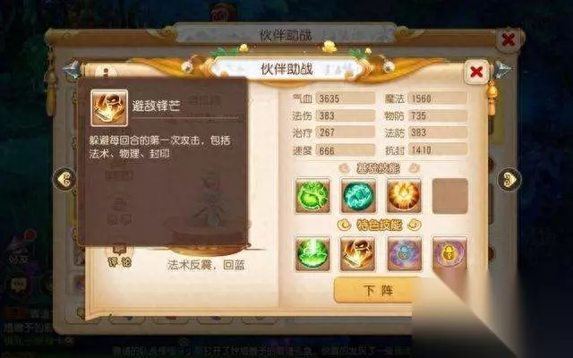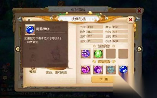 首先助战方面,有两位助战是必带的。第一位最重要的助战是蝎子精,180万银币解锁,可以说是性价比最高的助战了。初始特色技能倒马毒可以让攻击蝎子精的怪物中毒,而她的地脉特色技能则是在场上有3个以上中毒单位时,对它们造成极高的伤害。在签到任务拿到东海龙王后会获得一个助战培养礼包,可以将一名助战的天脉和地脉技能全部点出来,这里蝎子精只需要点出地脉毒雾缭绕技能就可以了。