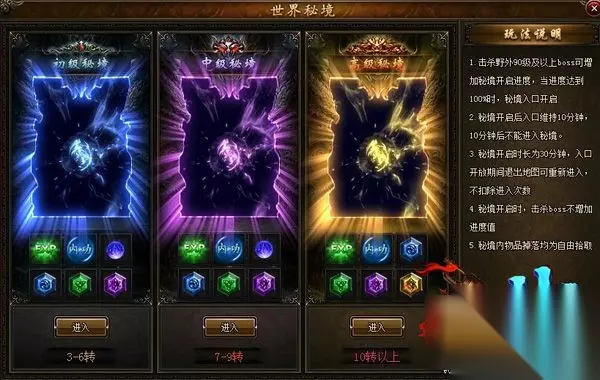 【世界秘境不是你想开想开就能开的】 当你进入《攻沙》传奇世界,你就会发现有一个闪烁着迷人光芒的洞穴出现在你的视线范围,但是当你轻轻点击,却发现你目前根本进不去。为什么?因为这个洞穴是通往世界秘境的大门,想要打开它,你需要不断击杀90级以上野怪及BOSS积累足够的封印解除能量。所以,世界秘境不是你想开,想开就能开的!