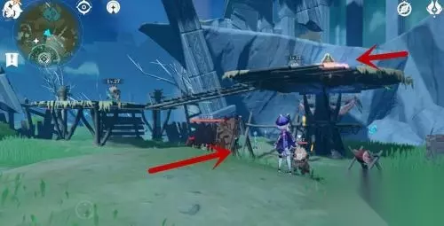 2、这儿有个丘丘人营地,营地上面有宝箱,先把下面的丘丘人全部击杀; 3、之后爬到这个木板上,开启珍贵宝箱,即可获取烤蘑菇披萨。