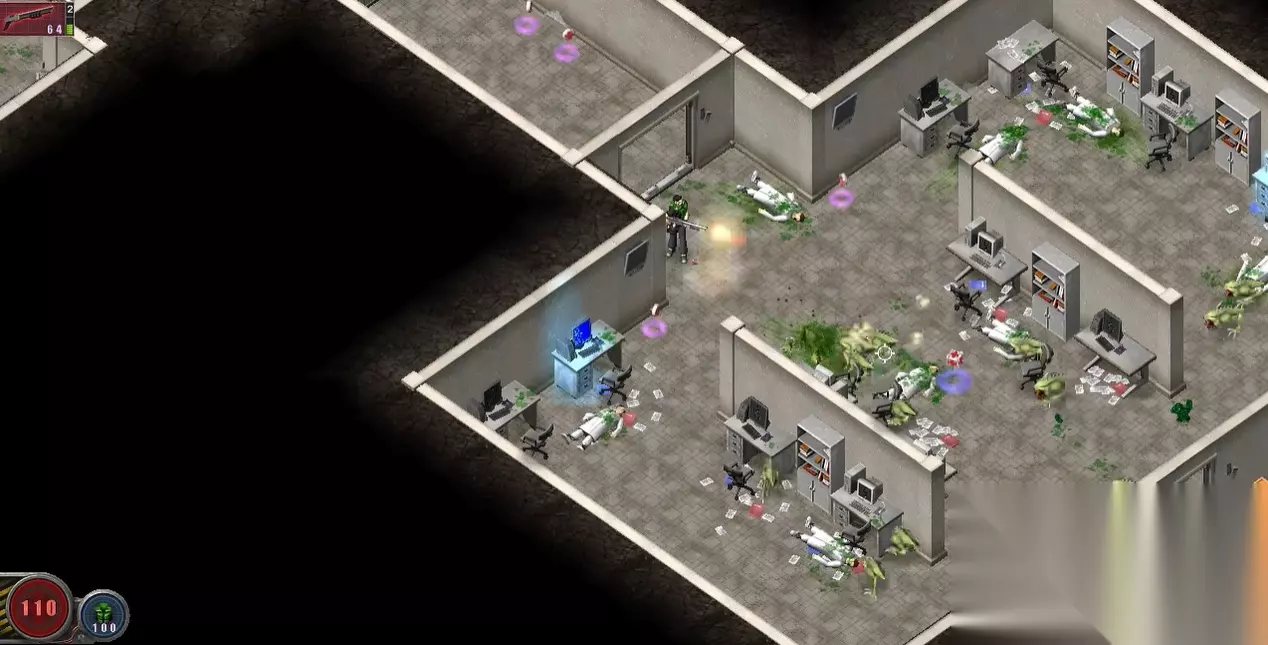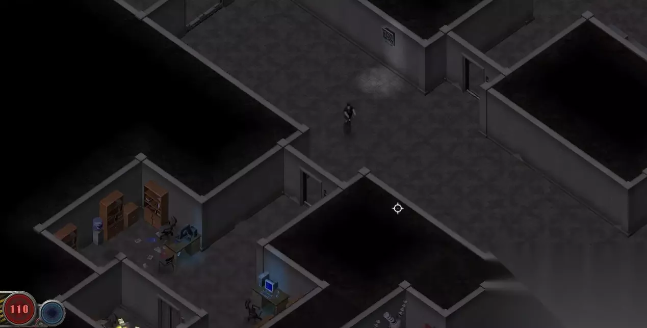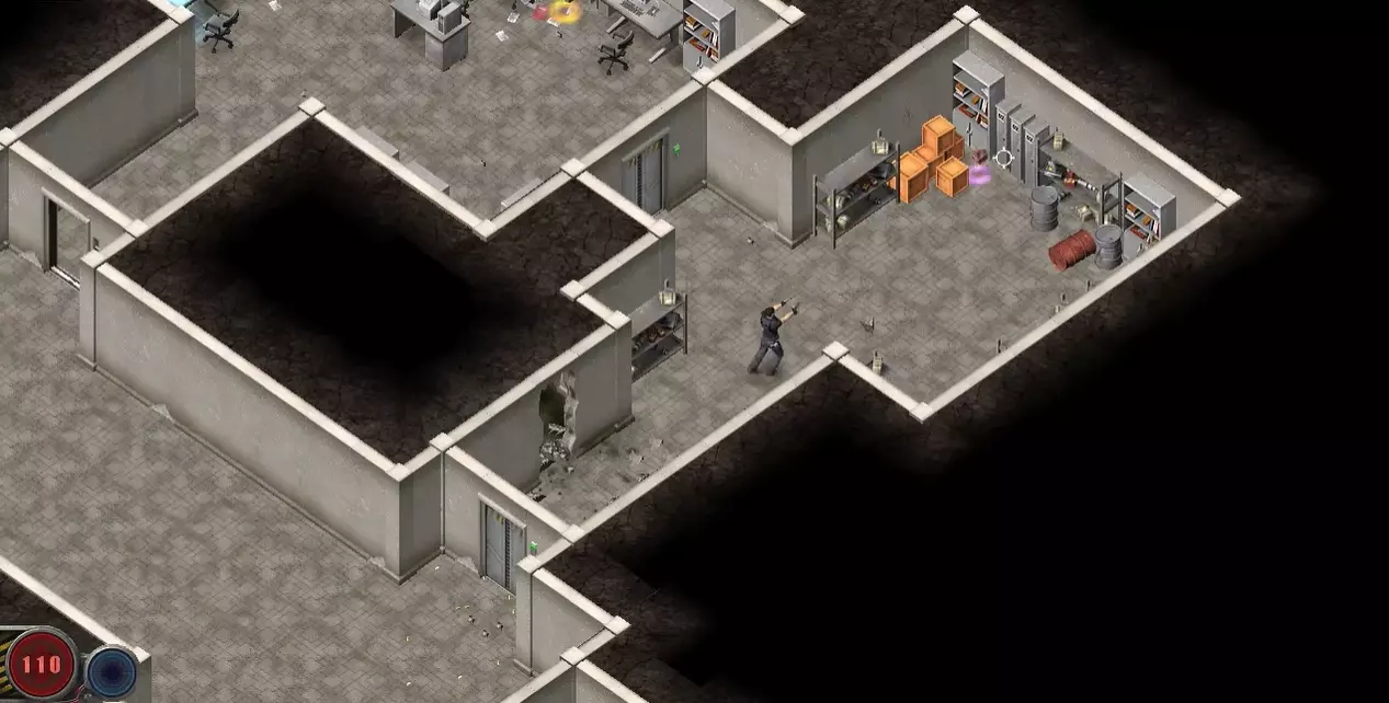 因为第二关开局是没有光线的,所以第一步必须先要找到电源开关,让室内亮起来。先往右下角一直走,在经过第一个路口后,继续往前走。然后可以在左下角看到一个代用红色箭头的标识,直接走上去,就可以将室内的电源接上。这样不仅地图会变得明亮起来,而且被关闭的自动门也可以打开了。然后往右上方走,在打开第一个自动门后,可以看到地上放着一个油桶。将其打爆后,可以在左边的墙上炸出一个洞。这里面有一些资源,可以进去捡一下。